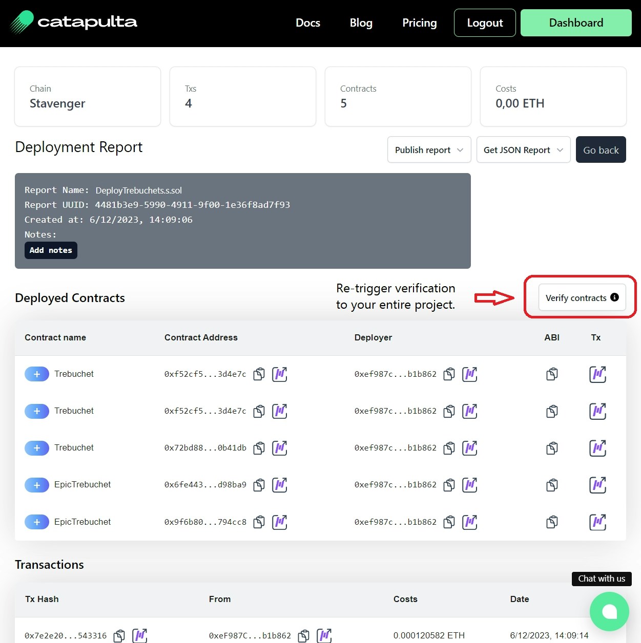 In case Blockscout is newly added to a network you already deployed with Catapulta, you can always re-trigger verification to your entire project with only one click, from your deployment report, and Catapulta will take care to migrate all the verifications to Blockscout block explorer.