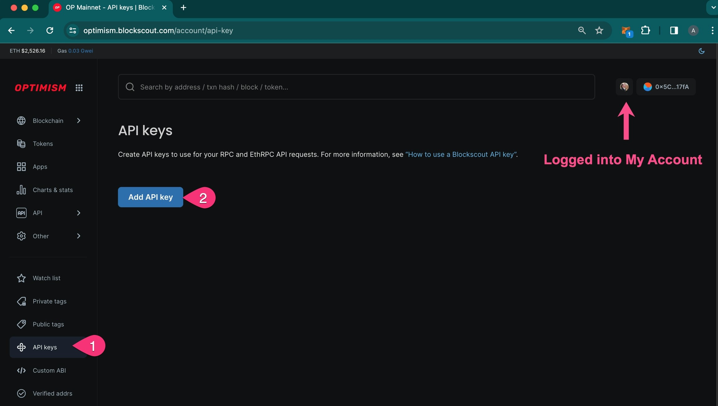 1) Login to My Account in Blockscout <login instructions> to get started. Once logged in:- Go to API keys in the user menu.